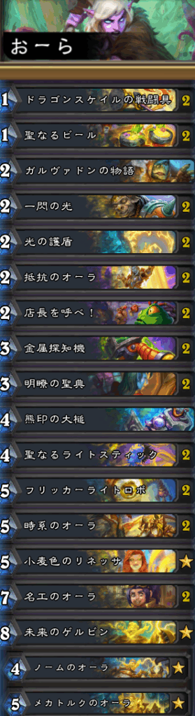 オーラ中心のパラディン。新拡張「タイムウェイの旅人たち」のカードは「時系のオーラ」と「未来のゲルビン」。他のカードセットからは「ガルヴァドンの物語」等が採用されている。