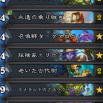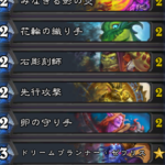 前の環境の機雷ローグに近い構成。「仮面の酔客」と「ストーンボーンの将軍」が加わったことで盤面にミニオンを展開して押し切ることが多くなった。動画では新カードが軒並み活躍してくれたうえ、「煙幕」での断末魔発動効果も使えたのでよかった!