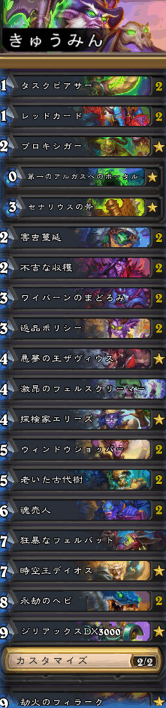 休眠ミニオンがいれば高スタッツの「永劫のヘビ」を4マナで召喚することができるデーモンハンター。列伝カードや断末魔シナジー等も採用されており、「魂売人」で色々なミニオンのコストを下げることができれば「時空王デイオス」と組み合わせてめちゃちゃできる。ひとまず今月はこのデッキでレジェンドに到達したので良かった!