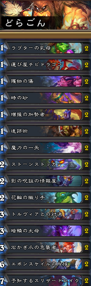 ドラゴン中心のハンター。新拡張「終焉のアゼロス」のカードは「運び屋チビドラゴン」と「増援の加勢者」と「影の呪詛の情報屋」と「トルヴィアとの対決」と「暗鱗の太母」と「石かぎ爪の急襲者」と「エボンスケイルの斥候」。他のカードセットからは「ラプターの乳母」等が採用されている。