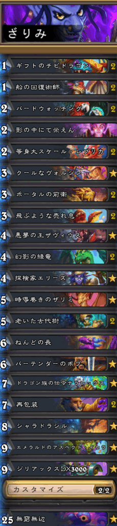 ドラゴン中心のプリースト。ミニセット「再生の日」のカードは不採用。報酬でもらった「ポータルの前衛」が採用されている。