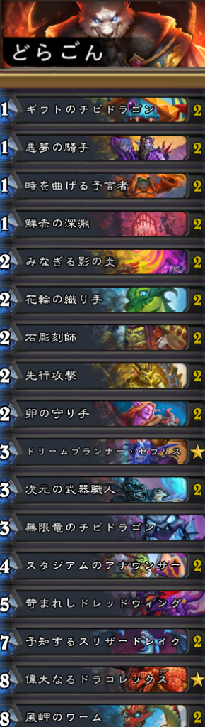 ミニセットでいくつか追加されたドラゴン採用のウォリアー。「次元の武器職人」のハンドバフ効果は単純に強力なうえ、悪夢で突撃のついたミニオンを発見しておけば打点が増えるのも嬉しい。「予知するスリザードレイク」が強いのは言わずもがな。ひとまず今月はこのデッキでレジェンドに到達したので良かった!