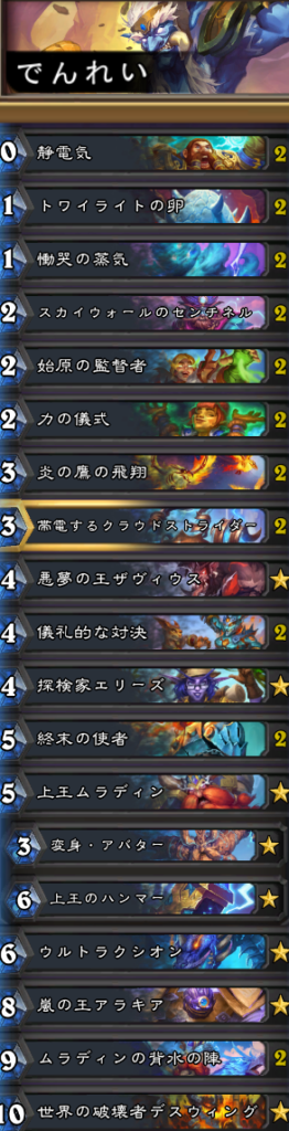 伝令中心のシャーマン。新拡張「終焉のアゼロス」のカードは「トワイライトの卵」と「スカイウォールのセンチネル」と「力の儀式」と「帯電するクラウドストライダー」と「儀礼的な対決」と「終末の使者」と「ウルトラクシオン」と「嵐の王アラキア」と「世界の破壊者デスウィング」。他のカードセットからは「炎の鷹の飛翔」等が採用されている。