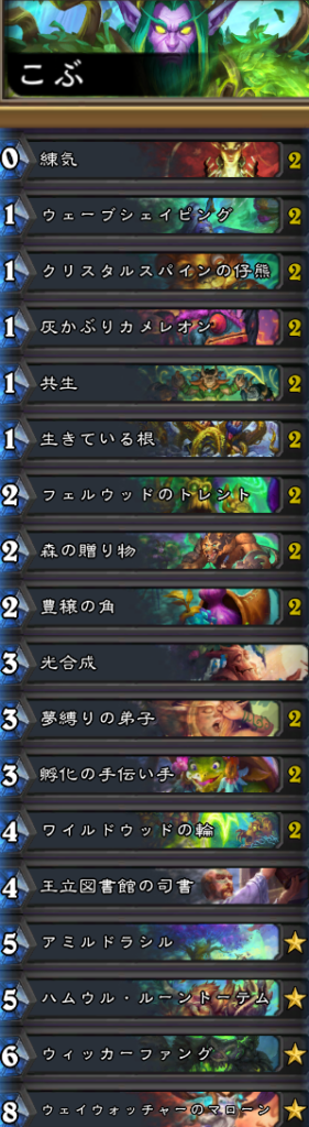 スペルで鼓舞する構成のドルイド。新拡張「終焉のアゼロス」のカードは「クリスタルスパインの仔熊」と「フェルウッドのトレント」と「森の贈り物」と「ワイルドウッドの輪」と「ウィッカーファング」。他のカードセットからは「ハムウル・ルーントーテム」等が採用されている。