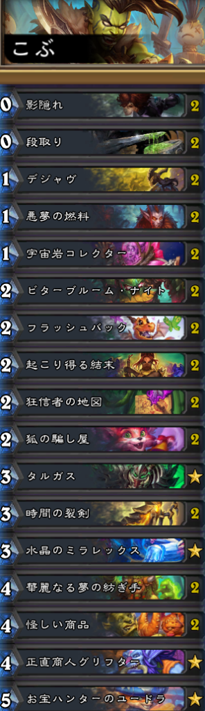 ミニセットで鼓舞ヒロパが追加されたローグ。鼓舞するとランダムなミニオンが手札にきたうえ、鼓舞の回数だけコストが下がっている。さらに巻き戻しも可能。動画ではひとまず鼓舞をふんだんに使えたので良かった!