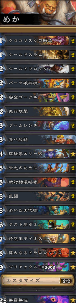 「時空王デイオス」の断末魔2倍効果で「テスト用ダミー」だけでなく「ブームレンチ」の効果も2倍にするウォリアー。武器1枚で32点、2枚あれば64点一気に出す事ができる。動画ではやりたい動きができたし、新カードも軒並み活躍してくれたので良かった!