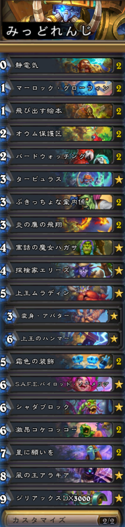 「星に願いを」と「シャダブロック」採用のシャーマン。「シャダブロック」はトークン召喚カードのみならず「寓話の魔女ハガサ」のミニオンの効果を3倍にすると強い。動画では「星に願いを」が活躍してくれたし、バフの乗った「風の王アラキア」でひとまず今月はレジェンドにいけたので良かった!