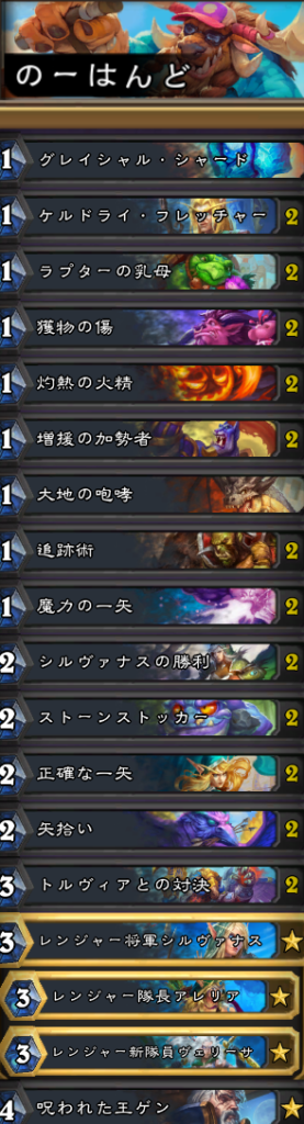 手札を全て使い切る構成のハンター。新拡張「終焉のアゼロス」のカードは「増援の加勢者」と「大地の咆哮」と「シルヴァナスの勝利」と「トルヴィアとの対決」と「呪われた王ゲン」。他のカードセットからは「ラプターの乳母」等が採用されている。