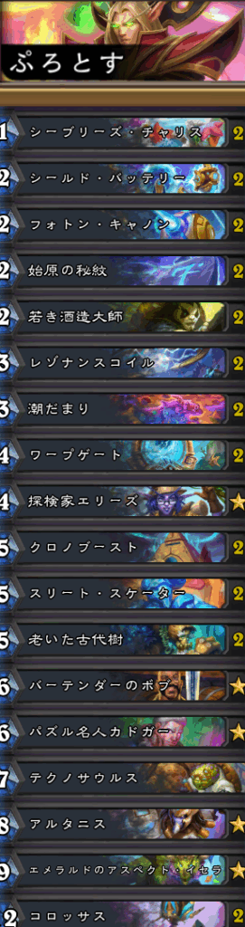 プロトス陣営中心のメイジ。ミニセット「再生の日」のカードは「テクノサウルス」。他のカードセットからは「潮だまり」等が採用されている。