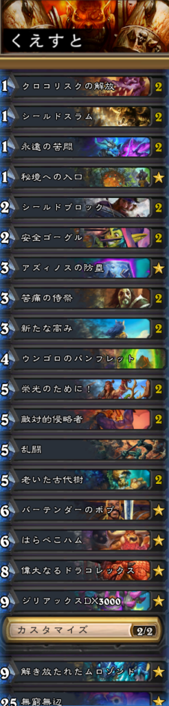 新カードの「永遠の苦悶」採用のクエストウォリアー。「永遠の苦悶」はその性能から「苦痛の侍祭」と相性が良い。後は単純にデッキを回しておけばクエスト達成後に「時間湾曲」を引き込みやすい。動画ではひとまず地味ながらも新カードが活躍してくれたので良かった!