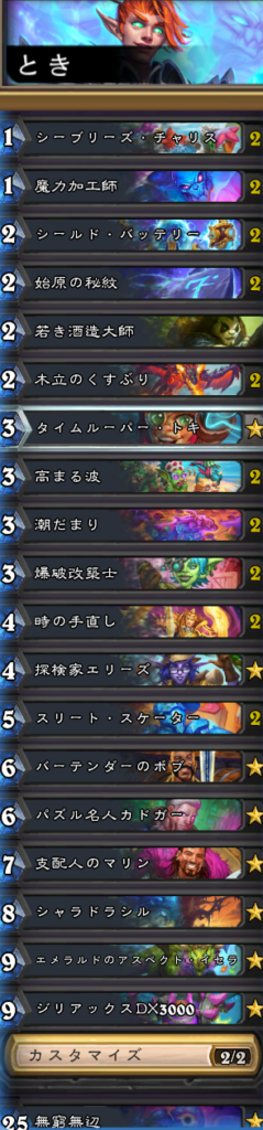 この前の調整で3マナになり強化された「タイムルーパー・トキ」採用のメイジ。3枚使えば手元に残る効果は以前に比べると格段に取り回しが良くなっていた。動画ではひとまず「タイムルーパー・トキ」を使い倒せたので良かった!