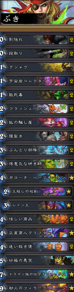 武器を強化する構成のローグ。新拡張「タイムウェイの旅人たち」のカードは「デジャヴ」と「フラッシュバック」と「ガローナ・ハーフオーケン」。他のカードセットからは「劫火のフィラーク」等が採用されている。