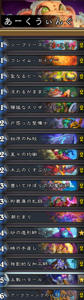 「アークウィングのパイロット」中心のメイジ。ミニセット「無限の残響」のカードは不採用。他のカードセットからは「独創的な加工師」等が採用されている。