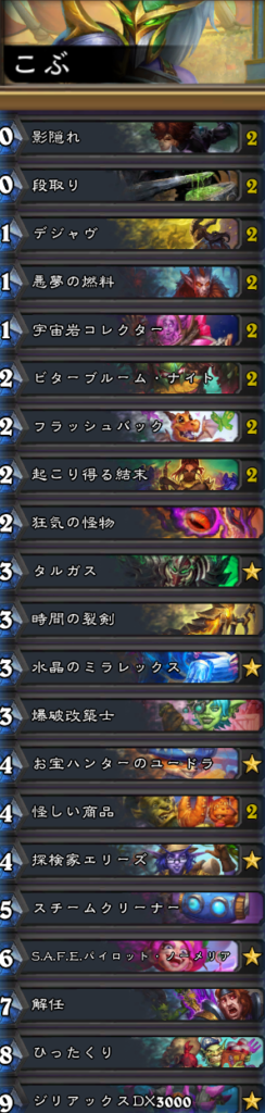 鼓舞中心のローグ。ミニセット「無限の残響」のカードは「起こり得る結末」と「時間の裂剣」。他のカードセットからは「お宝ハンターのユードラ」等が採用されている。
